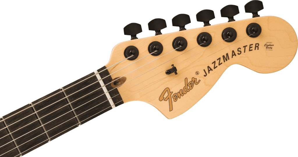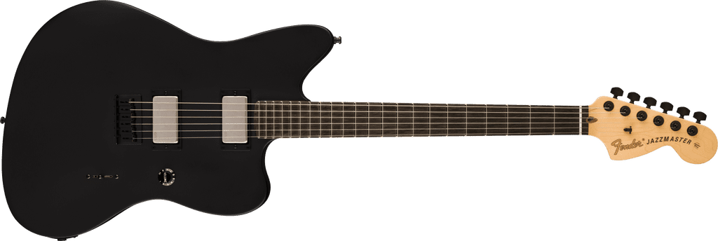 The Jim Root Jazzmaster also features a mahogany body with a comfortable contoured neck heel, satin-finish maple neck with "modern C" profile and large headstock, compound-radius ebony fingerboard (12"-16") with 22 jumbo frets and no position markers, staggered deluxe locking tuners, black hardware and pickup bezels, and an austere Flat Black satin-nitro lacquer finish. Includes black tweed case with red plush interior, strap and strap locks, cable and polishing cloth.