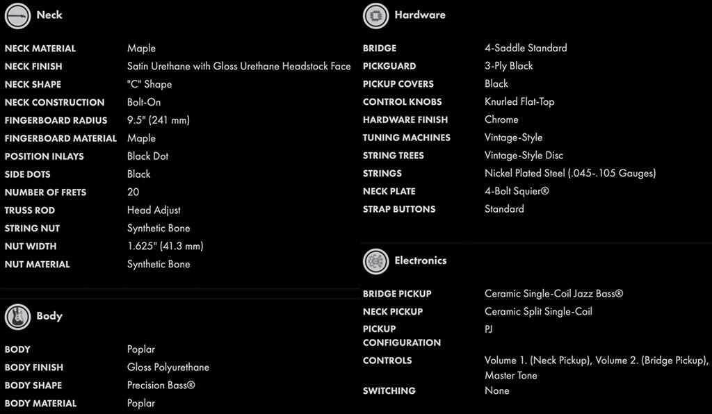 DESCRIPTIONA superb gateway into the time-honored Fender® family, the Squier® Affinity Series® Precision Bass® PJ delivers legendary design and quintessential tone for today's aspiring bassist. This P Bass® features several player-friendly refinements such as a thin and lightweight body, a slim and comfortable "C"-shaped neck profile and vintage-style open-gear tuning machines for smooth, accurate tuning. Loaded with a Squier split single-coil P Bass neck pickup and a single-coil J Bass® bridge pickup for a wide variety of tones, this model is ready to help lay the foundation for any player at any stage.