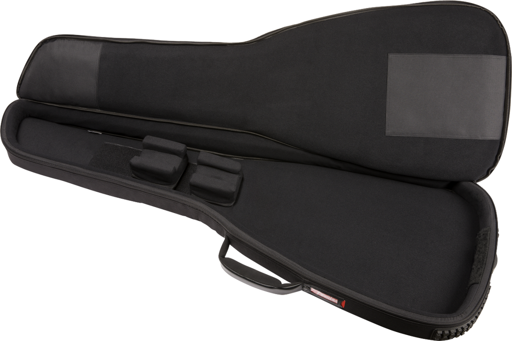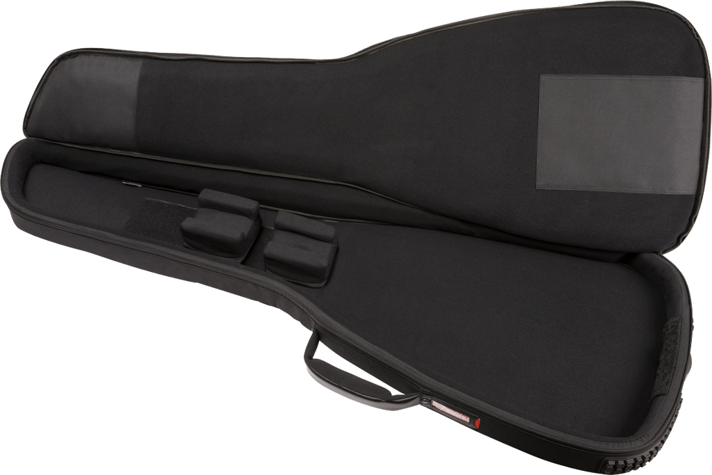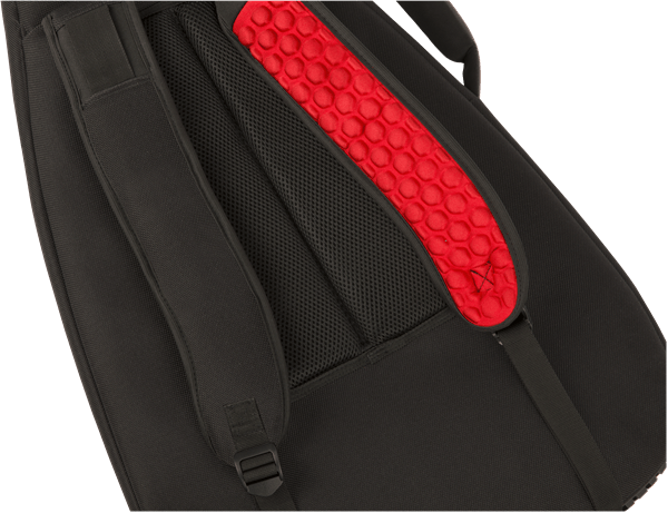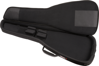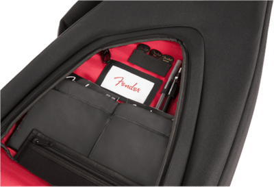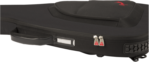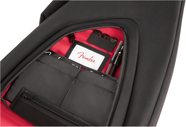 Fender's F1225 Series gig bag is the ultimate choice to keep your electric bass safe while traveling. Featuring our iconic asymmetrical instrument shape, its durable outer layer is constructed of tough 1200 Denier polyester that protects against impacts without ripping and tearing. Its interior is filled with 25mm padding lined with soft touch microfiber that keeps your instrument secure while avoiding finish damage. It even comes with two adjustable protective neck rests and exterior bumpers to minimize any strain on the instrument while in transit. The F1225 gig bag also comes with a super-padded handle and shock-absorbing EVA padded backpack straps with easily adjustable ladder lock buckles, so you can carry your instrument without physical strain. Plus, it features plenty of storage space with its large front pocket and zippered backpack strap pocket. The front storage pocket offers space for small accessories and has two dedicated pockets for extra strings, a removable padded tool pouch, three elastic pick pockets, two elastic pen loops, key fob hook and a business card window.
