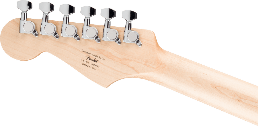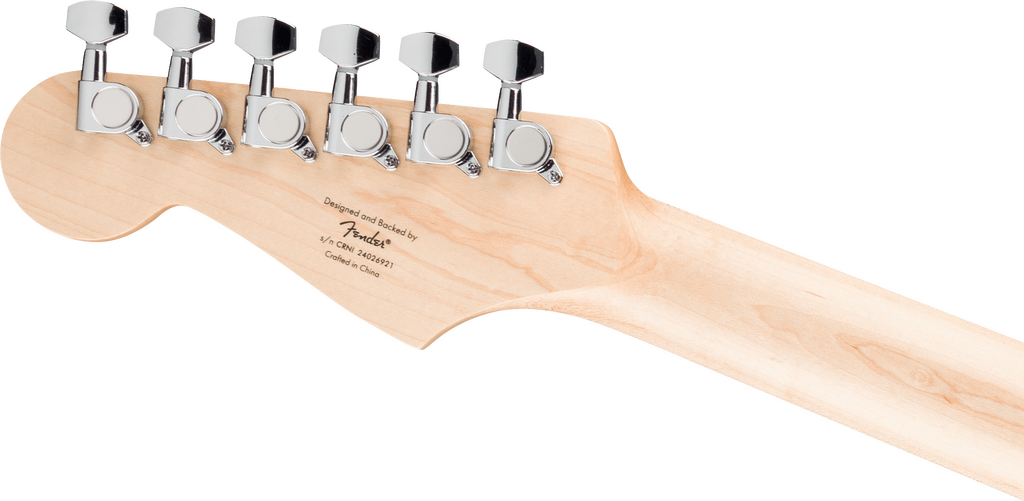 Designed by Fender® in California and an icon of rock & roll, the Debut Collection™ Stratocaster® features a slim “C”-shaped neck profile and a thin, lightweight body for a comfortable playing feel while three single-coil pickups with 5-way switching offer a wide variety of classic Strat® tones. Further details of this model include a tremolo bridge with removable arm for exciting string-bending effects, sealed-gear tuning machines for smooth, accurate tuning action and durable chrome hardware for a premium look.