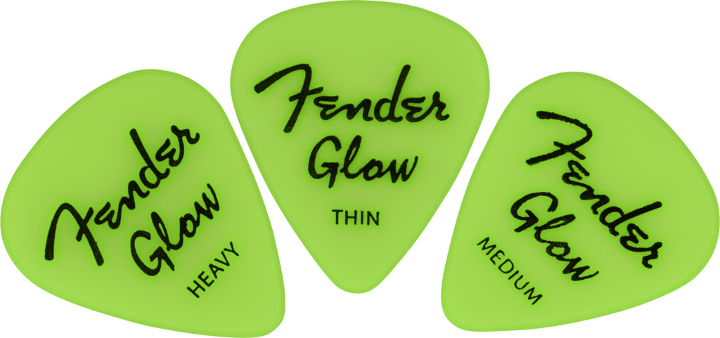 Strum in the dark with Fender glow in the dark picks. Made of our most popular material, cellulose acetate, the 351 shape is for players of versatile styles and techniques. Available in a 12 pack that includes 4 thin, 4 medium, and 4 heavy picks that offer multiple tonal and feel options.