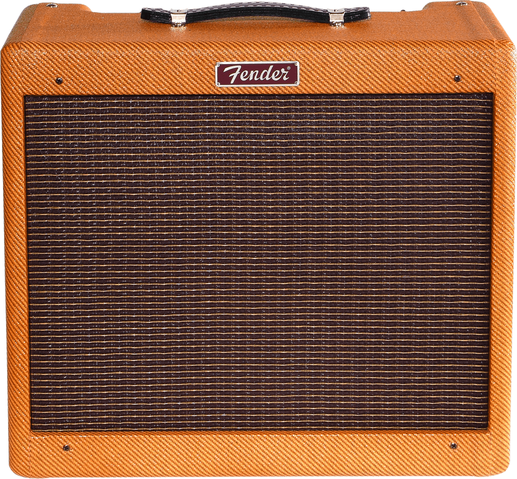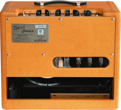 The Blues Jr. Lacquered Tweed takes Fender's 15W gem and gives it the true vintage treatment with a lacquered tweed covering and a vintage-voiced 12" Jensen speaker. Its golden tones are generated by an all-tube signal path using a pair of EL84 output tubes and 3 - 12AX7 preamp tubes. Add renowned Fender reverb, flexible controls, FAT switch for mid boost, and you're in business. And just look at that chrome panel, that tweed finish with vintage-style brown and gold grille cloth, and those vintage pointer knobs!