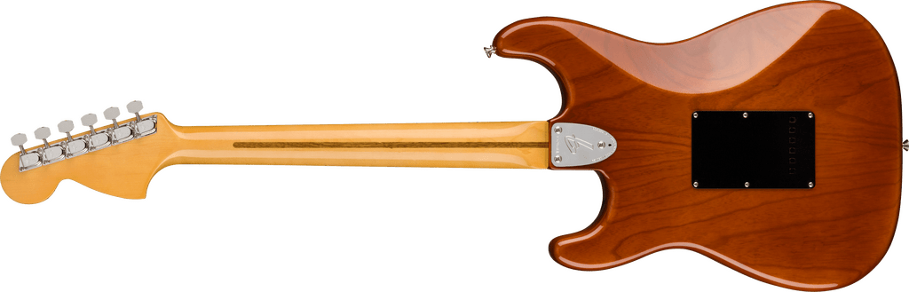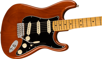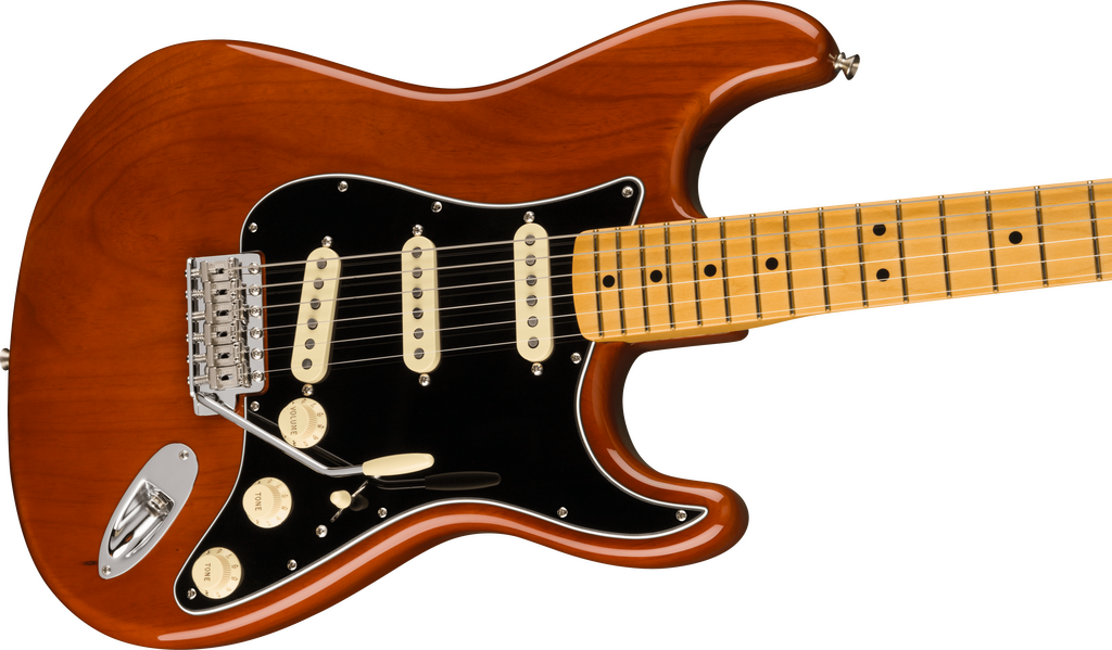 "Bullet" style truss rod nut and a three-bolt neck plate with Micro-Tilt™ mechanism. The "C"-shape maple neck plays like a dream with a 7.25" radius rosewood or maple fingerboard and vintage tall frets. The guitar is offered in three classic colors over ash: Aged Natural, Lake Placid Blue and Mocha, the latter being the first custom color ever to feature a black pickguard on a Strat®. Additional features include vintage-style "F" stamped tuners and a synchronized tremolo with bent steel saddles and cold rolled steel block. The instruments in the American Vintage II series are direct descendants of the original Fenders: designed for players with a fine appreciation