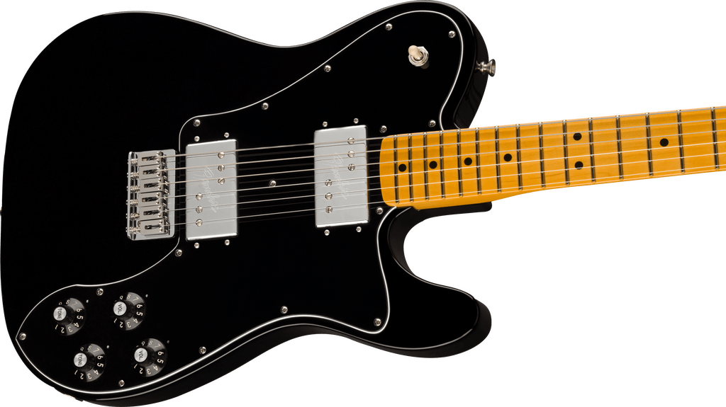 Featuring a '75 "C"-shape hard rock maple neck, the American Vintage II 1975 Telecaster Deluxe plays like a dream with a 9.5" radius maple fingerboard and medium jumbo frets. Characteristic of production in 1975, this Telecaster is outfitted with a convenient "Bullet" style truss rod nut, three-bolt neck plate with Micro-Tilt™ mechanism and offered in Black, Mocha Brown, or 3-Color Sunburst over an alder body. Other features include a 6-Saddle hardtail bridge with stainless steel block saddles and vintage-accurate Tele® Deluxe tuners.