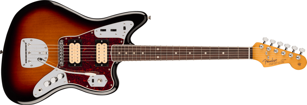 Fender's Kurt Cobain Jaguar® is a new-looking version of the battered and highly unusual 1965 Jaguar that Cobain wielded during the heady early-'90s era when Nirvana ruled rock and led a musically stunning and culturally subversive movement. Features include an alder body, bound fingerboard with pearloid dot markers, Stratocaster® headstock shape with 1950s-style "spaghetti" logo, DiMarzio® humbucking DP103 PAF 36th Anniversary neck pickup and DP100 Super Distortion bridge pickup, triple knurled "chrome-dome" knob configuration (volume, volume, tone), three-position toggle switch, black chrome Adjusto-Matic™ bridge and Gotoh® sealed tuners. Available in right- and left-handed versions. Accessories include a black textured vinyl hard-shell case and an exclusive Fender Kurt Cobain book with photos and commentary by Charles Peterson and an insightful interview with Nirvana guitar tech Earnie Bailey.