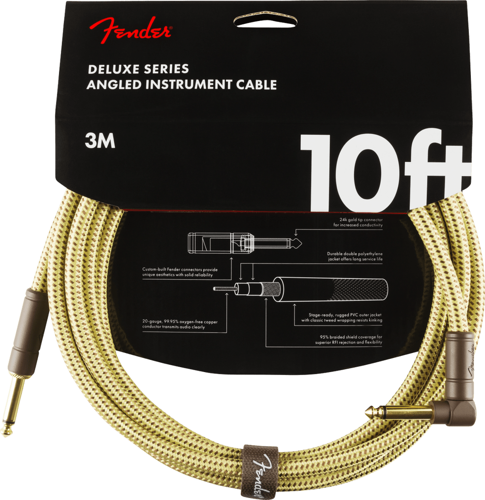 Fender Deluxe Series cables carry the highest quality materials and braided shielding to deliver flagship durability, conductance and transparency. Our top-of-the-line cables sport custom molded ends with strain relief under the housing - plus 24K gold-plated connectors that won't tarnish or degrade your sound over time. These cables use a very quiet braided shielding that is engineered to maximize the purity of your tone, and they're protected by a soft-woven yet rugged tweed jacket that provides ultimate protection with classic Fender style.