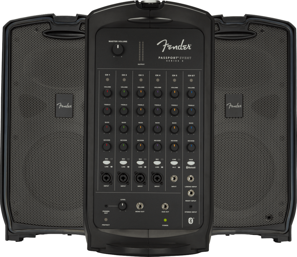The Fender® Passport® Event Series 2 is a self-contained portable audio system that includes everything for great sound anywhere, anytime. Carry Passport like a suitcase, and simply flip open the cabinet release latches for easy setup, with two full-range speaker cabinets, a powered mixer, and all cables needed.